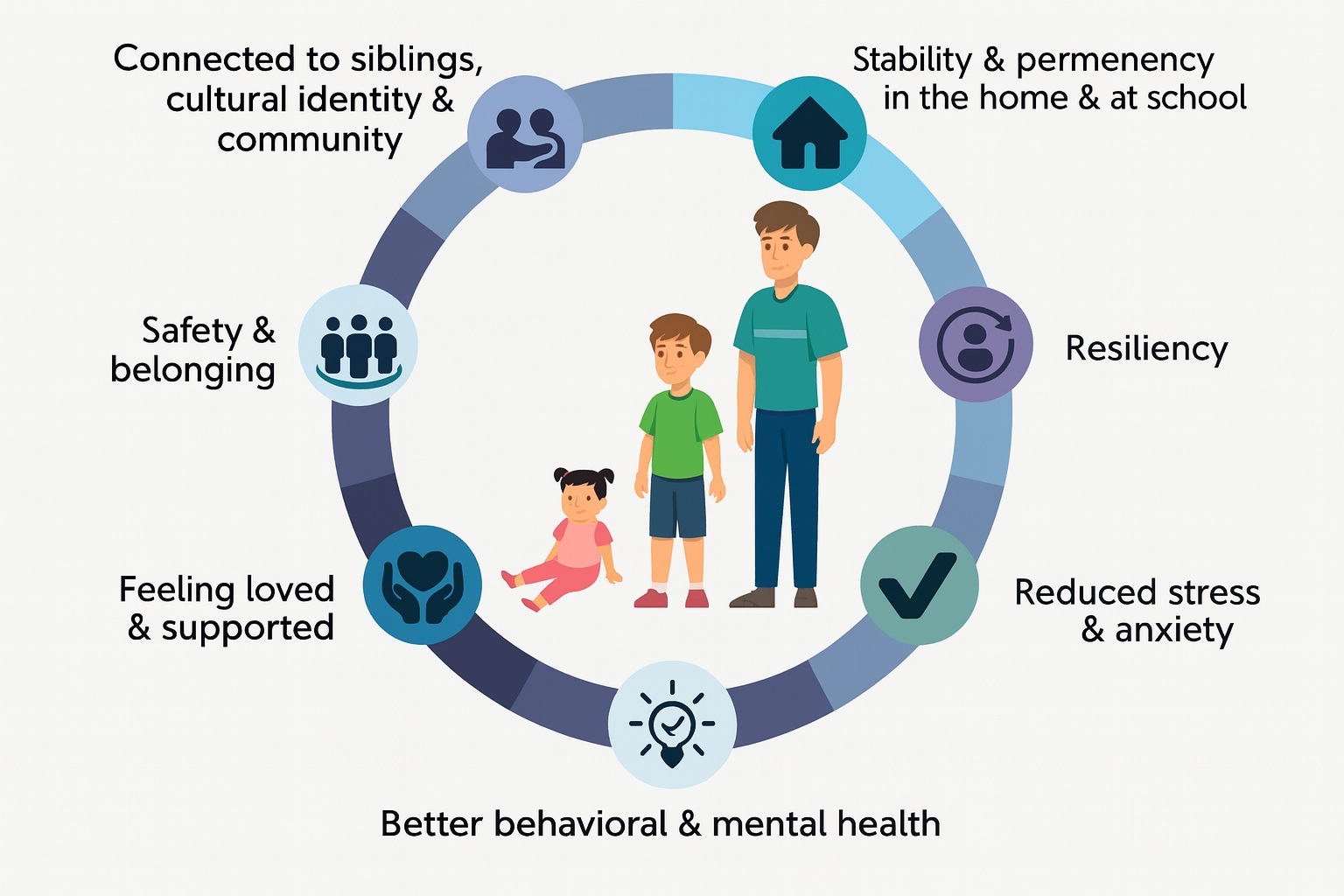When a child cannot stay with their parents, placement with a grandparent or kin caregiver offers something uniquely powerful: love, stability, and a deep sense of belonging. Children placed with relatives are more likely to feel safe and loved, stay connected to their siblings and community, and maintain their cultural identity—all of which help them grow, heal, and thrive.